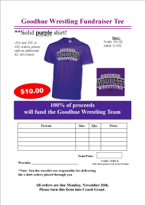 The annual Goodhue Wrestling T-Shirt Fundraiser is now available. This year offers a solid purple shirt with a black and white color screen print and a wrestler logo beneath. These are $10 each, and the size range is Youth XS to 3XL. For any XXL or XXXL, please add $2 ($12 total for those shirt sizes).