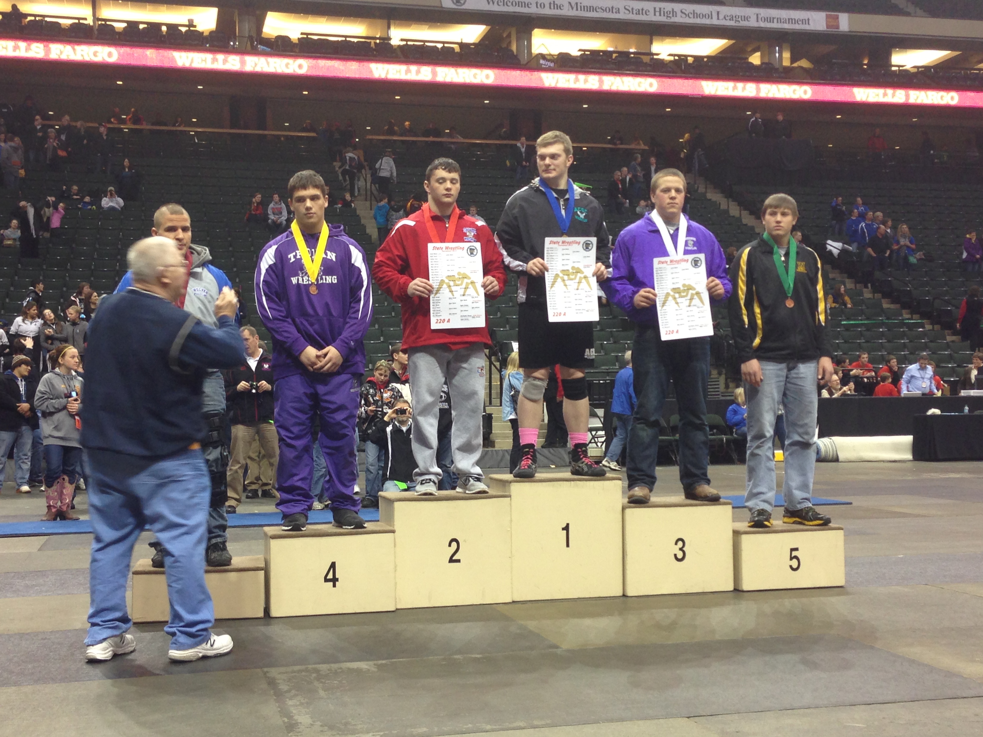 Ryan Tipcke competed in his final career match on Saturday evening as well. At 220 pounds, Ryan showed his balance and stamina against his big opponents. After a scoreless first period against Kyle Johnson of Barnesville, Ryan scored quickly off the mat with a one point escape. Aggressively looking for the takedown, Ryan picked up a second point in the period on a second stalling call. Still staying aggressive in the third period, Ryan’s opponent got away from underneath but couldn’t score a takedown, leaving Ryan getting his hand raised by the referee in his final match at the Xcel Energy Center. Ryan finished his senior season with a record of 38-9.