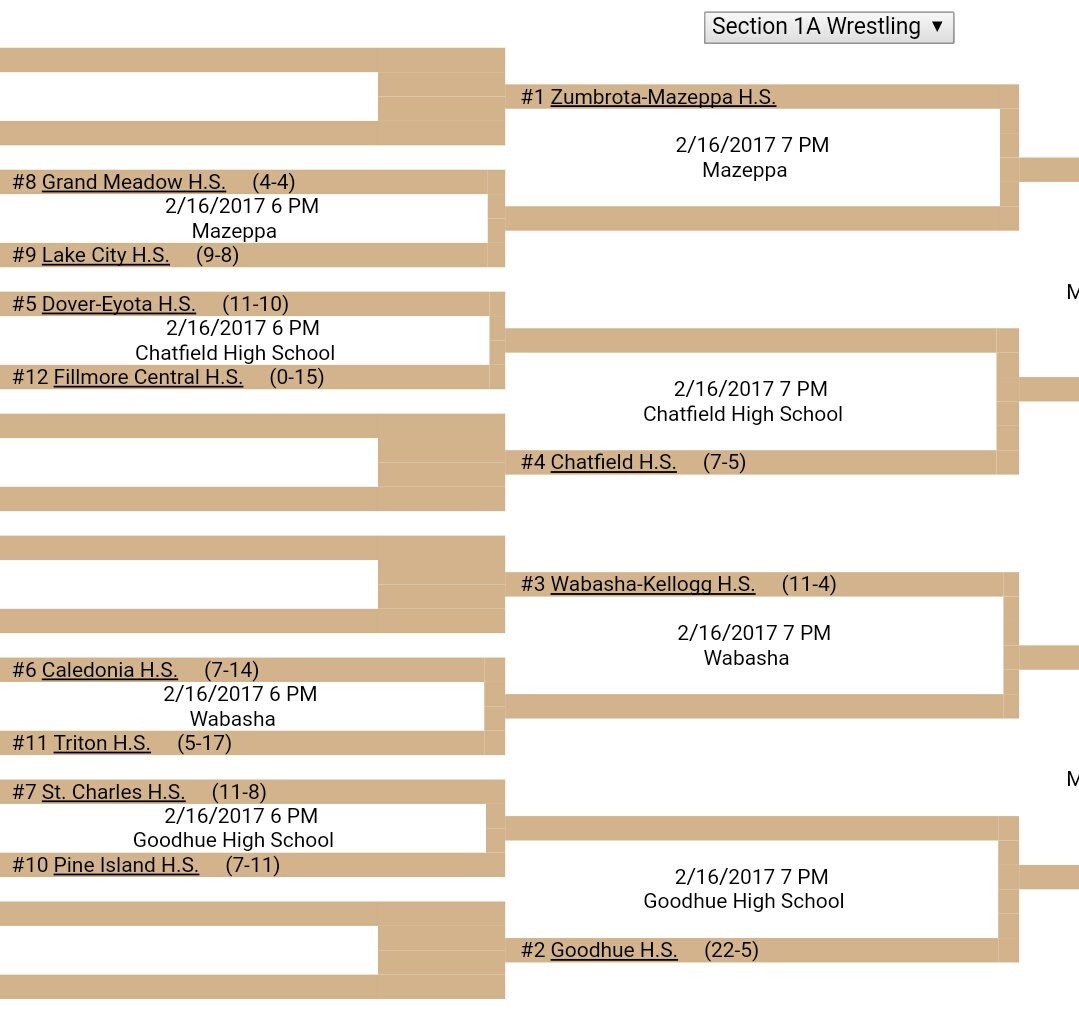St. Charles, the #7 seed, faces the #10 seeded Pine Island in the 6:00 bout. The winner will advance to the quarter-finals to face #2 Goodhue 15 minutes after the conclusion of the first round. See you tonight!
