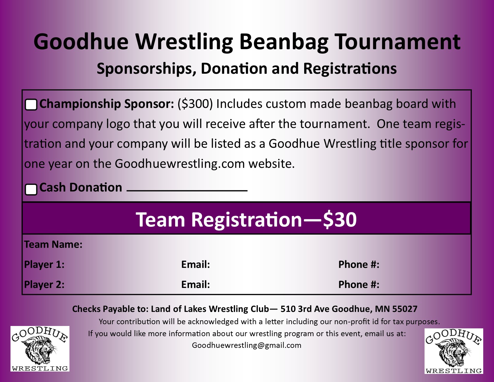 Pre-registration is encouraged for the tournament, details attached. If you have any questions or if you are interested in sponsoring a board for the event please contact GoodhueWrestling@gmail.com